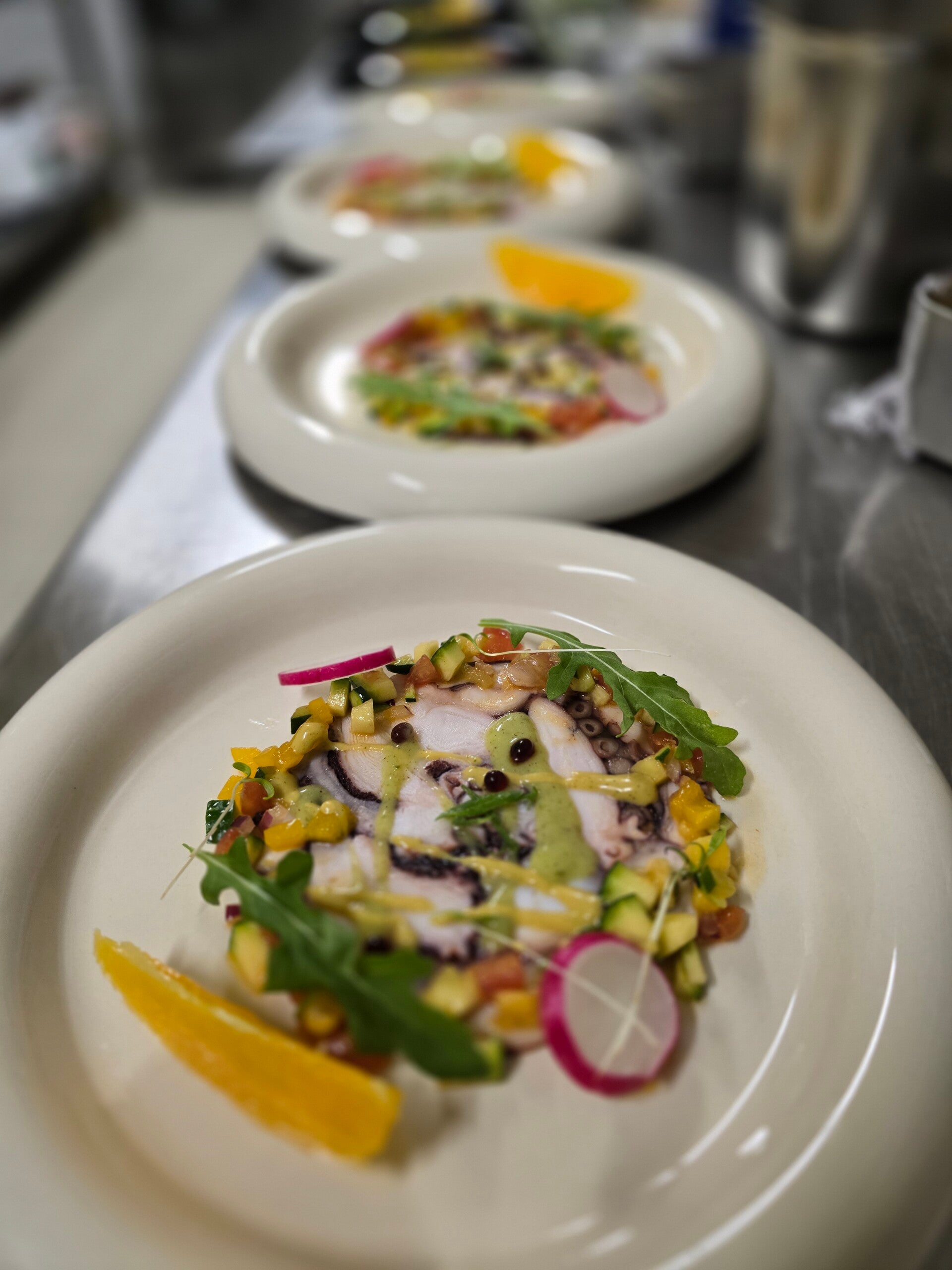 Selon les arrivages et l’inspiration du moment, certains plats peuvent être proposés à la carte ou à l’ardoise, permettant une cuisine vivante, spontanée et en lien direct avec le marché.