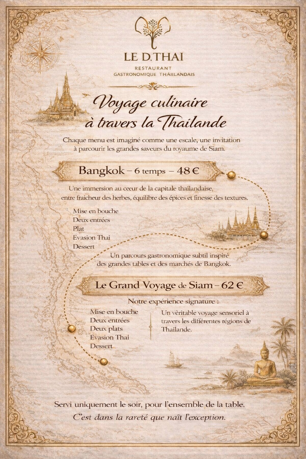 Au D.Thai, nous concevons chaque menu comme une expérience culinaire. Notre cuisine s’inspire des racines thaïlandaises tout en adoptant une approche contemporaine, précise et élégante. Nous travaillons exclusivement des produits frais, sélectionnés selon les saisons et l’état du marché. Les saveurs sont équilibrées, les épices maîtrisées, les textures contrastées. Chaque service est pensé comme une étape d’un voyage sensoriel.